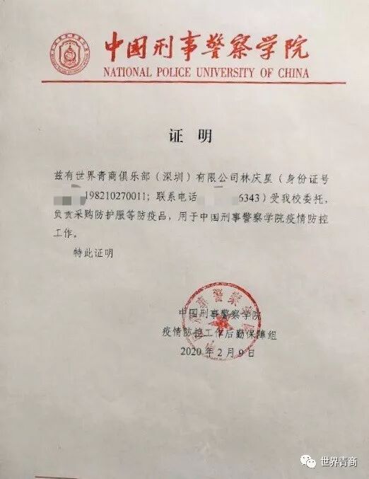 中国刑事警察学院委托世界青商俱乐部深圳分部采购防护服等防疫用品